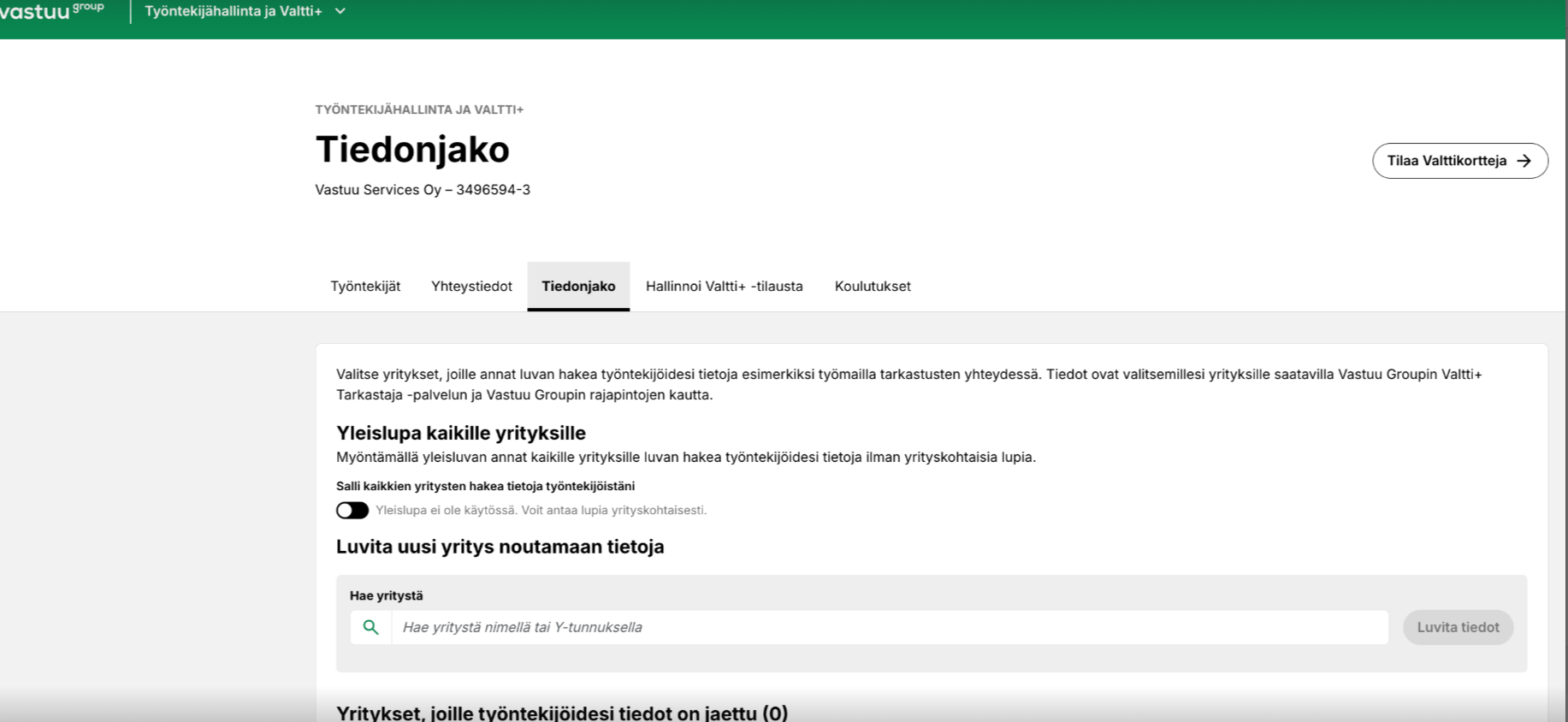 Valtti+ -palvelun tilannut yritys voi antaa oikeuksia pääasiassa päätoteuttajayrityksille hakea työntekijään liittyviä tietoja. Tämän voi tehdä ”Tiedonjako”-välilehdeltä