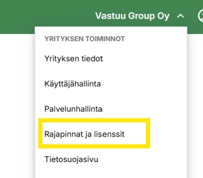 2.Navigoi Vastuu-portaalin etusivulla oikealle ylös alasvetovalikkoon ja valitse ''Rajapintatunnisteiden hallinta''.