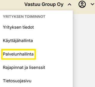 1. Navigoi asiakasportaalin etusivulla oikealle ylös alasvetovalikkoon ja valitse ''Palvelunhallinta''.