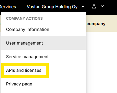 2. From the customer portal homepage, go to the upper‑right corner and select “APIs and licenses” from the dropdown menu.