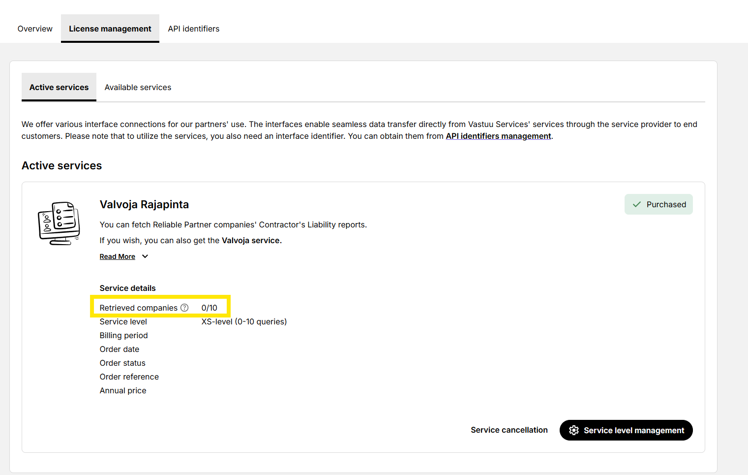 4. You will see the details of your Valvoja Rajapinta (API) license. Next to “Retrivied companies,” you can view your usage. That is, how many companies’ reports have been retrieved during the current billing period.
