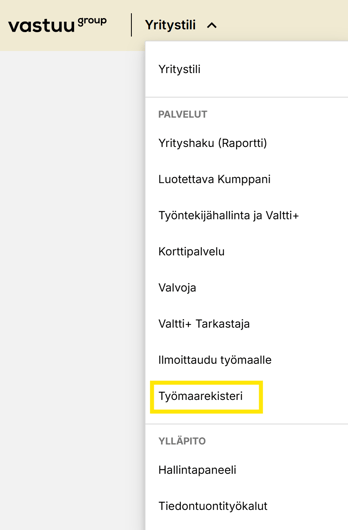 Kirjautuminen Työmaarekisteriin Vastuu-portaalin kautta Kirjautuminen Työmaarekisteriin Avaa Vastuu-portaalin etusivu. Valitse vasemmasta yläkulmasta alasvetovalikko. Klikkaa valikosta kohtaa Työmaarekisteri.
